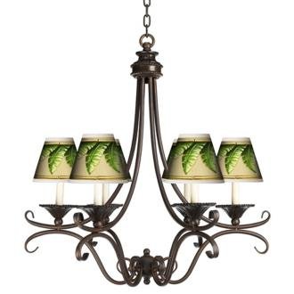 Enjoy the soft light of this stylish six light chandelier. It features a bronze finish with a hint of golden copper on the edges. The scroll design arms add a romantic look. Each clip-on shade features fabric trim and a fitter in a polished brass finish. Maximum bulb wattage of 25 watts is recommended for use with each of these shades. Bronze finish. Gold copper finish accents. Six custom printed giclee shades. Takes six 25 watt candelabra bulbs (not included). 28" wide. 28 1/2" high. Each shade is 3" across the top, 6" across the bottom, and 5" high.
