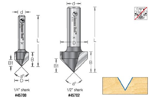 Amana Tool 45712 Carbide Tipped V Groove 90 Deg x 5/8 Dia x 1/2 Cut Height x 1/2 Inch Shank Router Bit